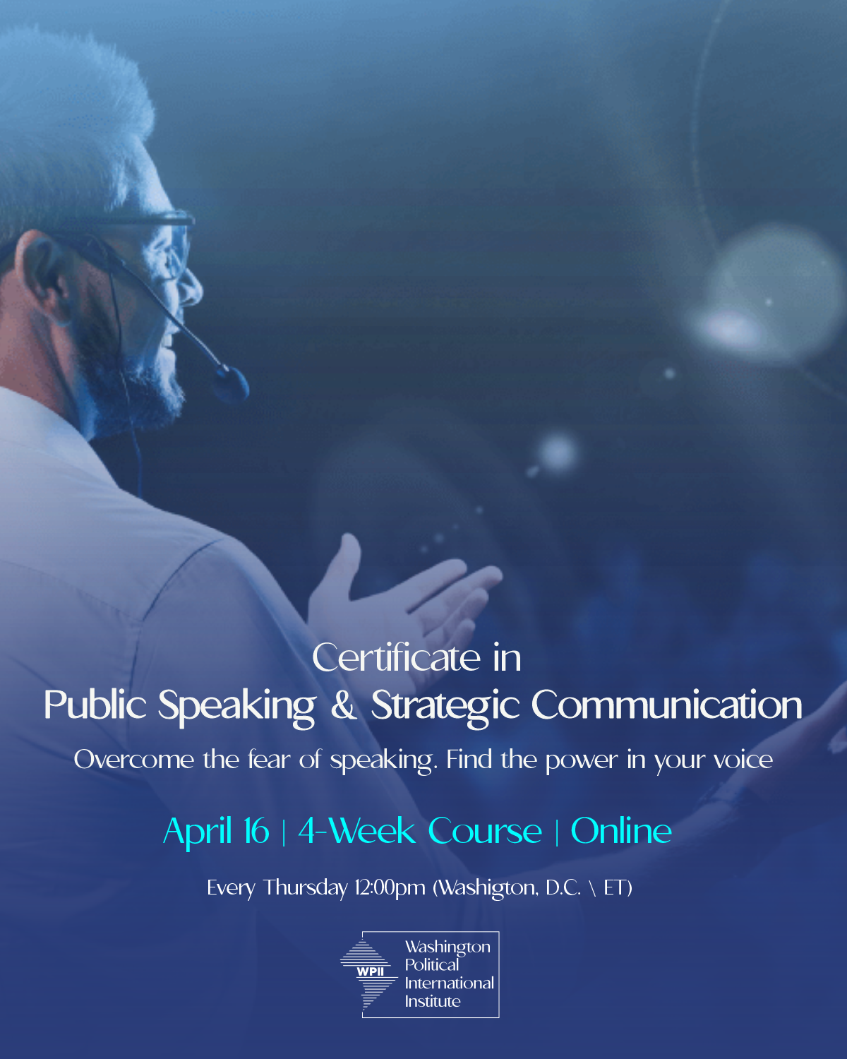 Participants will learn how to overcome the fear of speaking and discover the power in their voice, while developing the skills needed to communicate with clarity, confidence, and impact. The course will also focus on vocal control, tone, pacing, and delivery, helping participants strengthen their presence and engage audiences effectively. By the end of the program, participants will be better equipped to structure persuasive messages and speak with confidence in political, institutional, and professional settings.